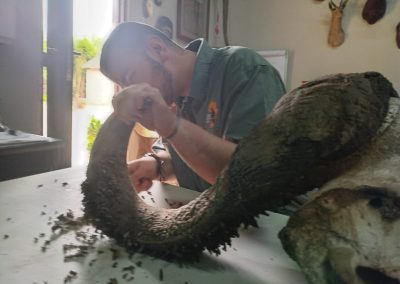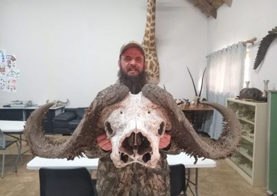 Die uitgestrekte bosveld van Limpopo roep altyd na avontuur, en so ook die daaglikse take by die beroepsjagkursus. Onlangs het ‘n besondere uitdaging op my en Johann, ons hardwerkende langtermynstudent, gewag. ‘n Monumentale buffelskedel, die trotse toonbeeld van krag en wildheid, het ons aandag geverg. Hierdie spesifieke skedel is hier in Limpopo gekry en is deur ‘n egpaar van Texas, Amerika, saamgebring vir ons om te gebruik, want hulle is vol vertroue in ons vermoĂ«ns. Dit sal ‘n sleutelrol speel in die opkomende beroepsjagkursus, en daarom moes ons verseker dit is in onberispelike toestand.