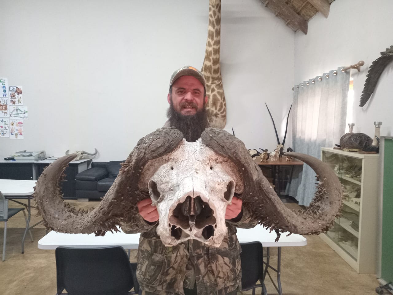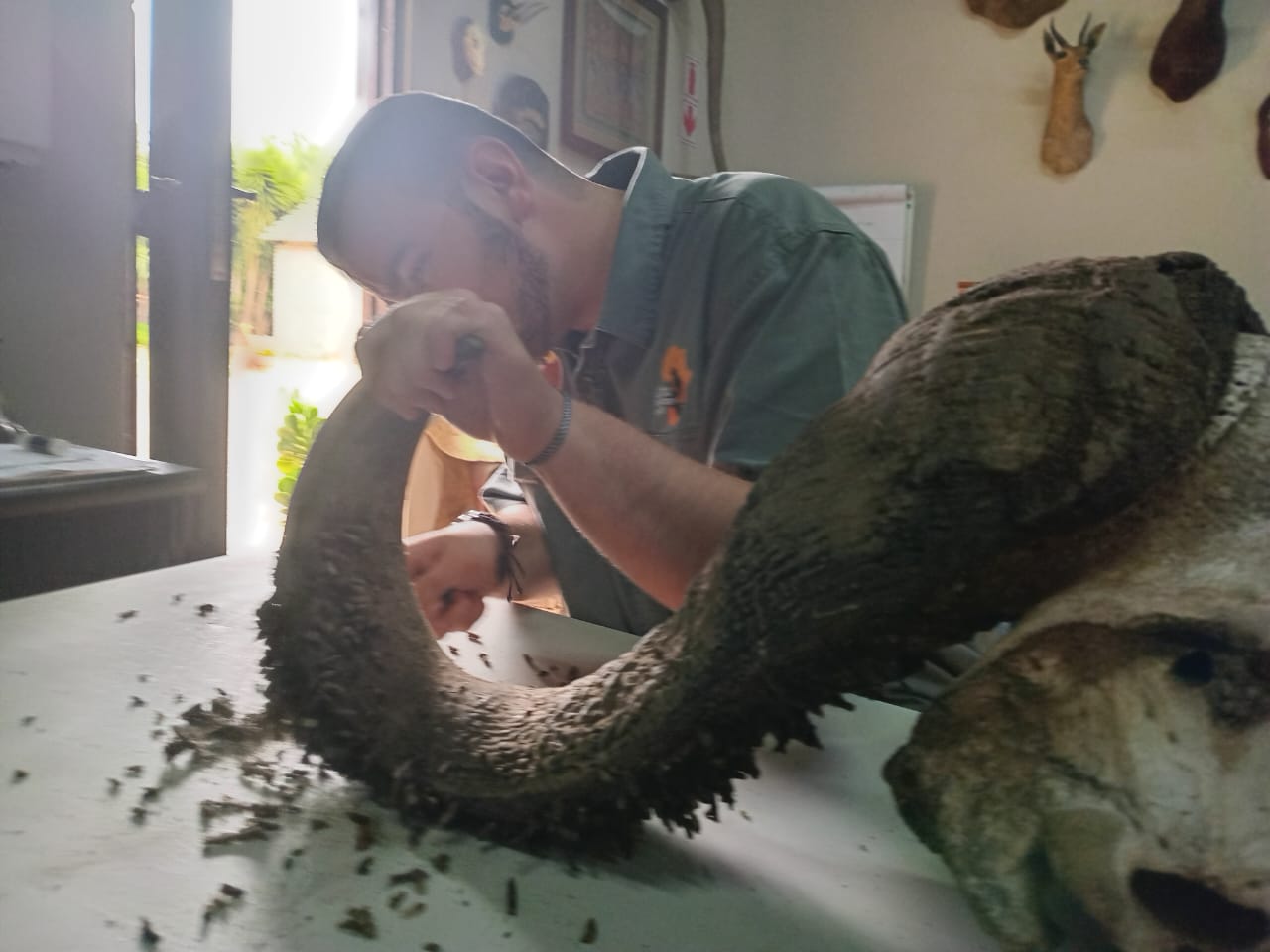 Die uitgestrekte bosveld van Limpopo roep altyd na avontuur, en so ook die daaglikse take by die beroepsjagkursus. Onlangs het ‘n besondere uitdaging op my en Johann, ons hardwerkende langtermynstudent, gewag. ‘n Monumentale buffelskedel, die trotse toonbeeld van krag en wildheid, het ons aandag geverg. Hierdie spesifieke skedel is hier in Limpopo gekry en is deur ‘n egpaar van Texas, Amerika, saamgebring vir ons om te gebruik, want hulle is vol vertroue in ons vermoĂ«ns. Dit sal ‘n sleutelrol speel in die opkomende beroepsjagkursus, en daarom moes ons verseker dit is in onberispelike toestand.